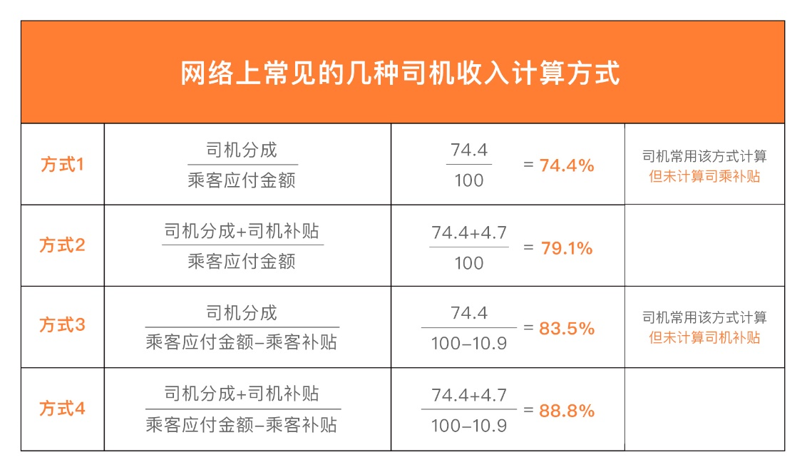 如图4所示,网络上出现过多种计算司机收入占比的方式,近期我们收到个别司机反馈及媒体报道“抽成高”,普遍是按照方式1或方式3计算。
