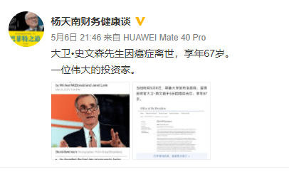 大卫·史文森的去世在投资界引起了很大反响,多位私募大咖社交媒体发文纪念。