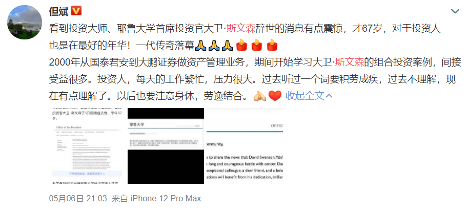 5月6日晚,深圳东方港湾投资管理股份有限公司董事长但斌发微博,看到投资大师、耶鲁大学首席投资官大卫·斯文森辞世的消息有点震惊,才67岁,对于投资人也是在最好的年华!一代传奇落幕!