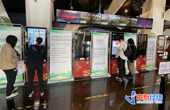5月1日,在中影国际影城(千禧街店),观众在自助取票机取票。中新经纬 张猛 摄