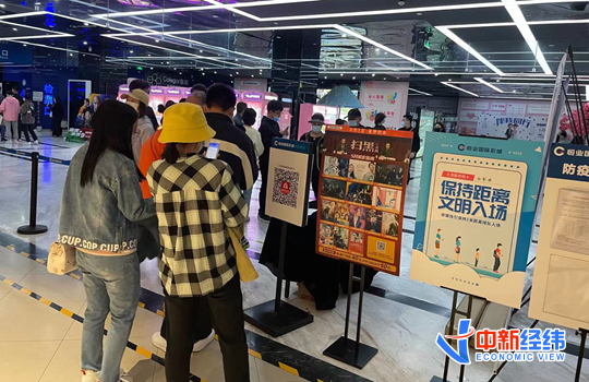 5月2日下午,在恒业影城北京IMAX店(北京银座和谐广场购物中心店),观众排队进行防疫登记扫码。中新经纬 张猛 摄