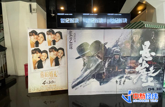 中影国际影城(千禧街店)店摆放的《悬崖之上》《你的婚礼》电影海报。中新经纬 张猛 摄