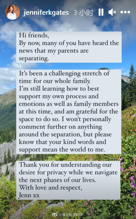 5月3日下午,盖茨家的大女儿、25岁的詹妮弗·盖茨在社交媒体上发声,称全家人度过了“一段充满挑战的日子”。而比尔和梅琳达两人也分别在社交媒体上发出了联合离婚声明。