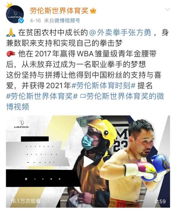 当时张方勇收到的邮件,是劳伦斯官方发来的评选通知,还没有最终确定入围。北京时间4月16日,张方勇正式获得2021年劳伦斯体育时刻的提名。