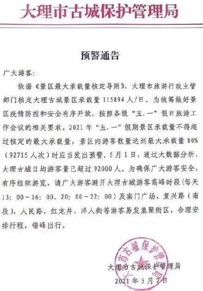 5月1日,云南大理古城游客量超92000人,接近景区最大承载量的80%,大理市古城保护管理局发布预警通告。