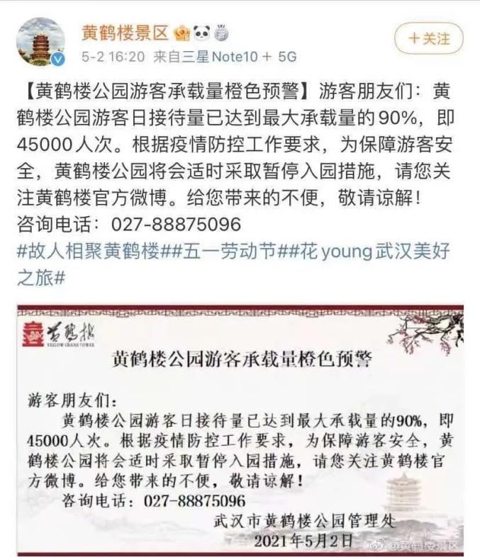 武汉黄鹤楼5月2日下午一度发布了公园游客承载量橙色预警,称其游客日接待量已达最大承载量的90%。