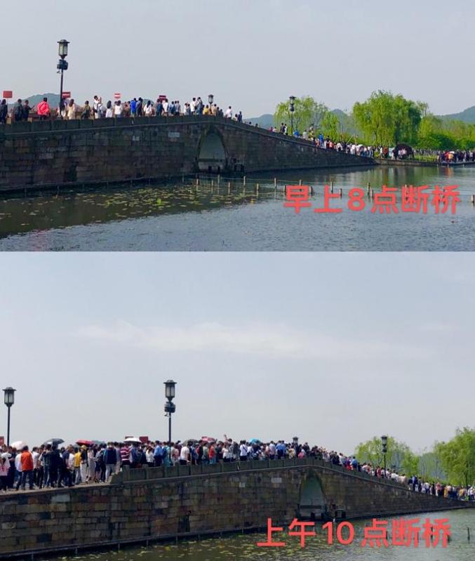 5月1日,大量游客涌入杭州西湖景区,早上八点左右,西湖就开启了“人人人人”模式,来自全国各地的游客们挤在一起向前移动,断桥变身“人桥”。