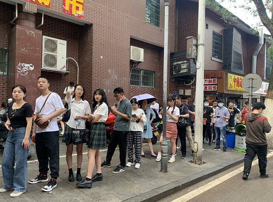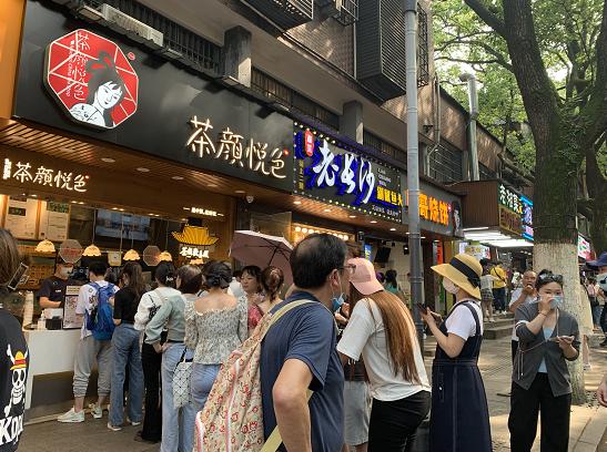 在登高路上有两家茶颜悦色,记者见到,每家门店前都排着十来个人,队伍的最后还有一位店员在进行引导。" 想点单的请到马路对面排队,现在队伍排到兰州拉面前前面了。" 原来,因为排队的人太多,登高路上人流量特别大,排队的人只能隔着这条马路在对面排队、队伍大概也排了近 10 米长。" 简直是隔空排队啊,太疯狂了。" 原本还想排队买奶茶的麦女士感叹道,已经久闻茶颜悦色的大名,这次来就是想试试的。一开始还以为排队的人不多,准备等一等,没想到长队已经排到了马路对面。