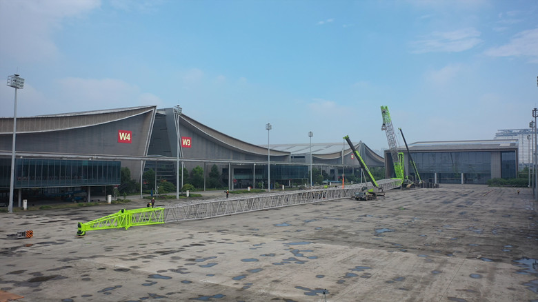 (5月8日,长沙国际会展中心,技术人员正在有序组装中联重科ZCC13000超大型履带起重机。这是2021长沙国际工程机械展首台入场布展的设备。)