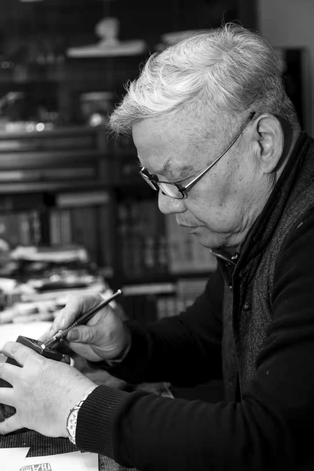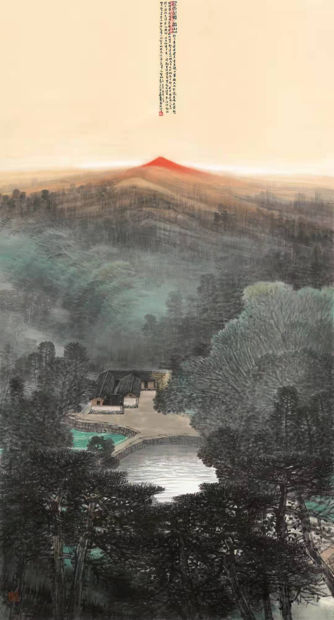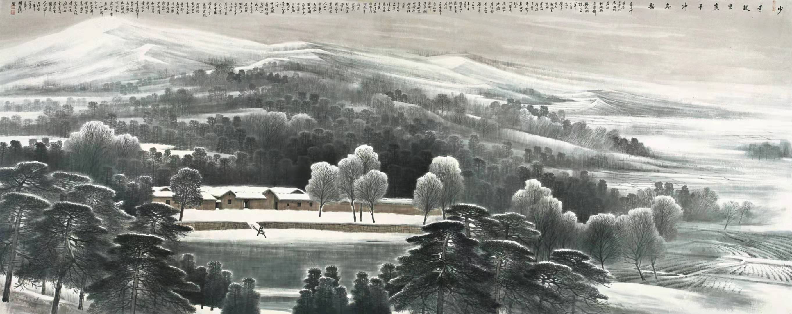 三、有一种蓬勃生气,叫得“器”、得“技”、得“道”相辅相成的高远意境。“画到生时是熟时。”艺术家要让作品散发出春天万物勃发、欣欣向荣的生气,就要按照“别有洞天,才能别开生面”的要求,正确处理得“器”、得“技”、得“道”的辩证关系。“器”是艺术的载体,这是基础;“技”是艺术的技巧,这是基本功;“道”是艺术的思想和规律,这是最高境界。得“器”容易,得“技”难,得“道”更难。老子说:“道生万物。”把“器”上升为“技”,把“技”转化为“道”,创作才能生机无限。胡立伟的作品较好地把“器”“技”“道”统一起来了。从“器”来看,笔墨纸砚,书画一同。他把线条的刚柔曲直、提按顿挫,墨色的干湿枯润、浓淡厚薄,运用自如,得心应手。从“技”来看,他的山水画讲究笔墨之妙,既体现了疏密有致、虚实相生、笔断意连、计白当黑、无中生有的美学传统,又集合了岭南绘画的色墨淋漓、写生细腻,江南绘画的重笔重墨、空灵飘逸,北方绘画的重峦叠嶂、风骨雄健,开创了我之为我、新新不已的艺术天地。从“道”来看,他的作品天然去雕饰,注重宇宙天地之间客观物象与主观生命生生不息的交融和流动,形成了中国画最高境界“意境”的创造。正如他所言:“技巧上的成熟是艺术生命终结的开始,只有把诗意、情韵、墨趣渗透到绘画当中,作品才具有生命力。”他曾经办过“远山回望”的画展。如果说“远山”本身的呈现更多是“器”与“技”在起作用,那么“远山”背后的 “在水一方”“诗与远方”,才是“道”的境界,是艺术家的远大追求。《少奇故里·炭子冲冬韵》就蕴藏着一种潇湘灵韵的“大道”,当我们看到一幅笼罩在天地茫茫、白雪皑皑中的刘少奇故居图时,一种对领袖洁白无瑕的高尚品质无限崇敬之情油然而生。