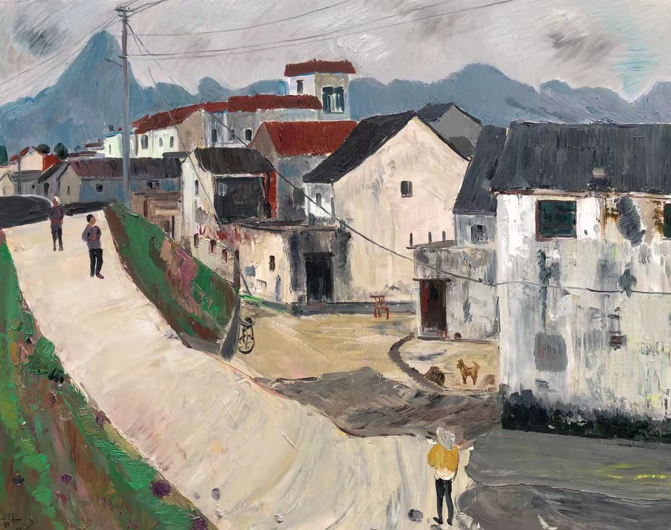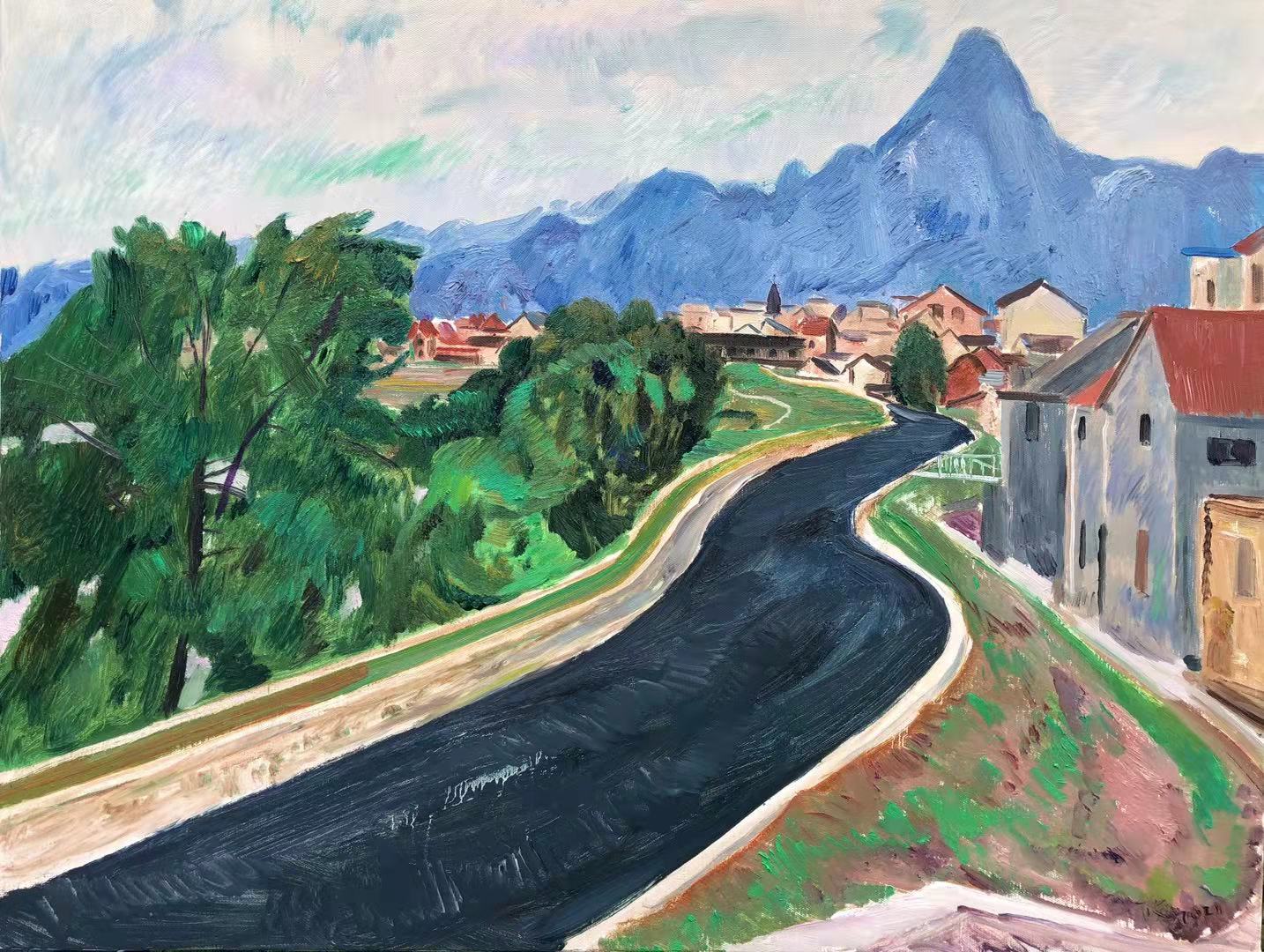 远处眺望,浦阳江诸暨牌头镇长潭埠村段是一片少见的开阔农村江景,遗落在青山怀抱中的古村落,还有隐约可见的高铁和高速公路疾行的车辆,古代和现代元素融合一体。在画家的笔下定格成一幅幅青山秀水、粉墙黛瓦的山水画卷。