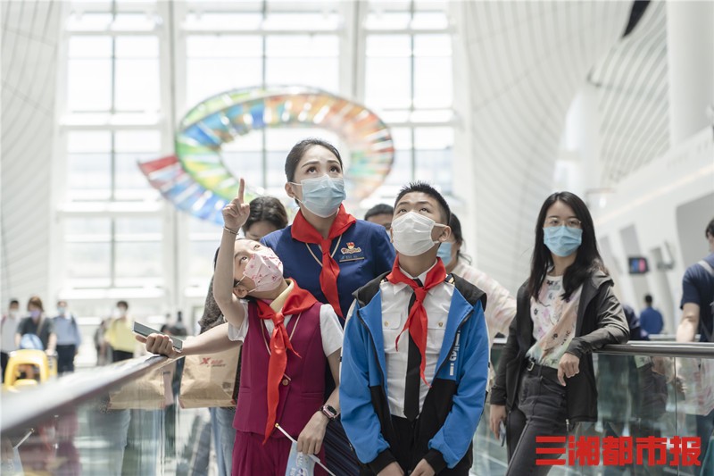 “妈妈,我们到北京啦!”兴奋的小嘉航一直走在队伍的前列。到达北京后,孩子们在南航湖南分公司乘务长曾文卓和原南航湖南分公司驻村扶贫工作队队长、全国脱贫攻坚先进个人熊劲松的带领下,参观了北京大兴国际机场,体验了北京的轻轨,然后乘坐地铁前往天安门。