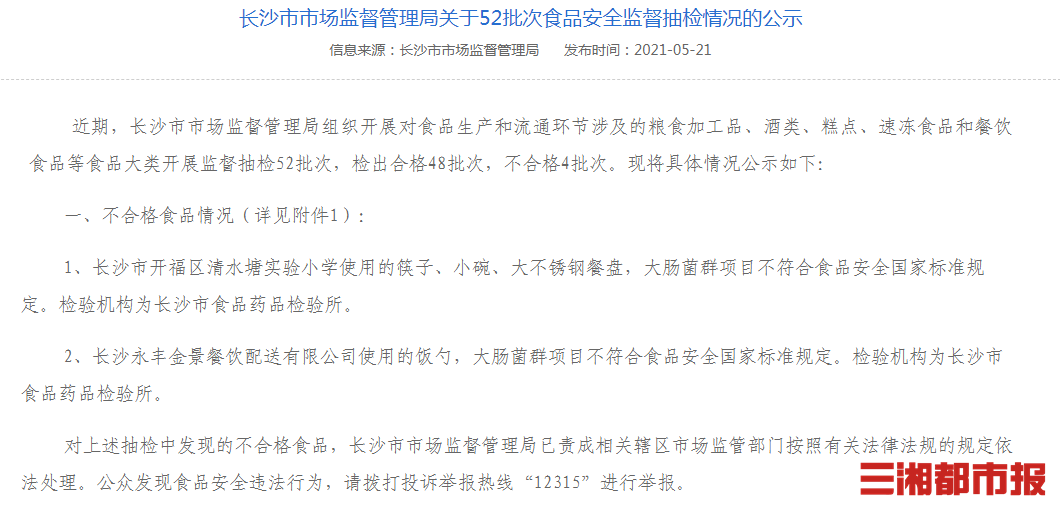 三湘都市报·新湖南客户端5月25日讯(记者 黄亚苹)近日,长沙市市场监管局官网公布52批次食品安全监督抽检情况。该局组织开展对食品生产和流通环节涉及的粮食加工品、酒类、糕点、速冻食品和餐饮食品等食品大类开展监督抽检52批次,共检出4批次不合格餐具。