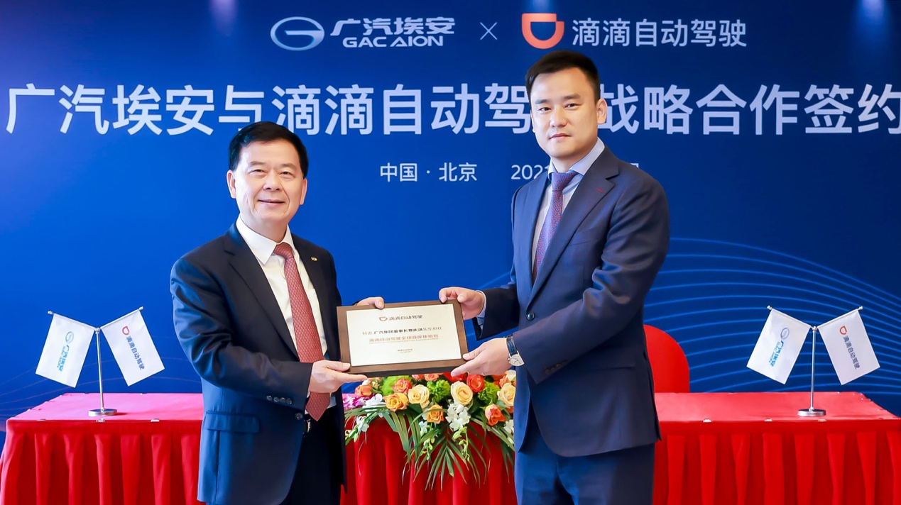 (滴滴出行CTO兼自动驾驶CEO张博(右)邀请广汽集团董事长曾庆洪(左)成为滴滴自动驾驶全球首席体验官)