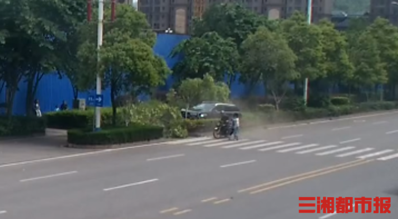 视频画面显示,5月5日下午14时48分,娄底城区福星路上,一辆黑色小车突然失控冲上路旁绿化带,接连撞倒两棵绿化树后才停下。而这台车行驶方向前方不远,一台摩托车上三人吓得踉跄逃离。