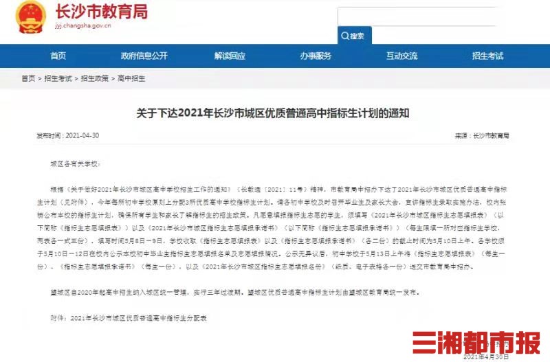 三湘都市报·新湖南客户端5月1日讯(记者 杨斯涵 黄京)不到两个月时间就要中考了,指标生将如何分配?4月30日,长沙市教育局中招办下达了2021年长沙市城区优质普通高中指标生计划,今年每所初中学校原则上分配3所优质高中学校指标生计划。
