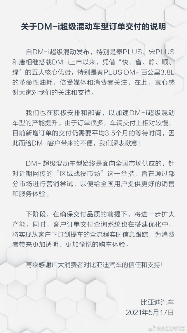 近日,网络上有关比亚迪DM-i车型战役市场及车源分配的信息,引起了准车主们的热议。5月17日上午,比亚迪汽车在官方微博就此事发布了官方声明。