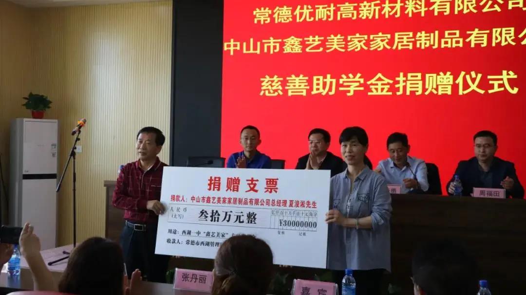 捐赠仪式上,广州市白云化工实业有限公司行政总监周福田、常德优耐高新材料有限公司总经理洪青永以及中山市鑫艺美家家居制品有限公司总经理夏浚淞向西湖教育基金会、西湖一中专项教育基金理事会共捐赠善款80万元。