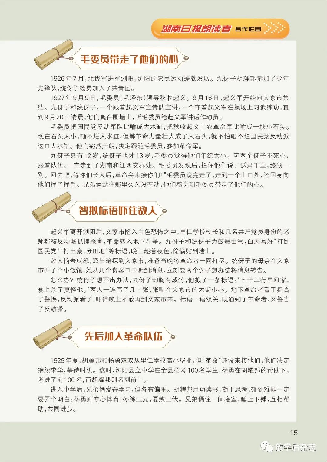 1926年7月,北伐军进军浏阳,浏阳的农民运动蓬勃发展。九伢子胡耀邦参加了少年先锋队,统伢子杨勇加入了共青团。