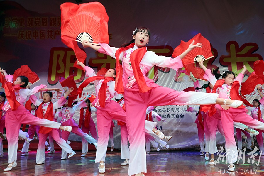 5月21日,临武县第六中学体艺中心,学生在表演舞蹈情景剧《映山红》。为庆祝中国共产党成立100周年,当天,临武县举行“阳光下成长”——第十八届中小学艺术节活动,学生通过唱响爱党歌曲、表演颂党舞蹈等节目,展现新时代少年热爱党、热爱祖国、奋发进取、积极向上的良好精神风貌。 陈卫平 摄