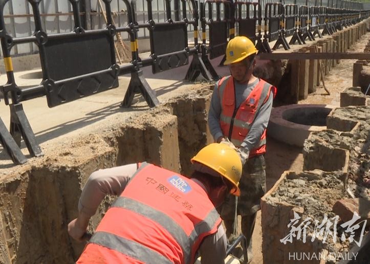 湖南日报·新湖南客户端5月4日讯(通讯员 张劲杨 毛丹 记者 龚柏威)5月4日,沅江市政管网雨污分流改造工程科技路段施工现场,工人们正在进行新建污水管顶覆砂分层夯实及污水检查井清理工作。中建五局沅江水环境综合治理项目执行经理詹宇凡介绍,五一假期,沅江市中心城区水环境综合治理一期工程PPP项目多个施工点同时进行施工,稳步推进工程建设。