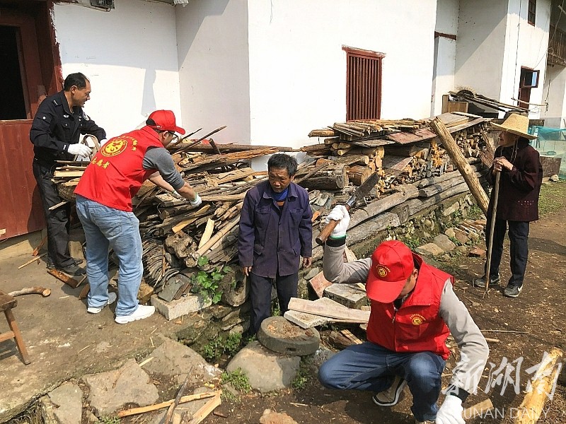 ▲青山乡组织“村务员”志愿服务队对孤寡老人、困难户开展卫生帮扶活动.