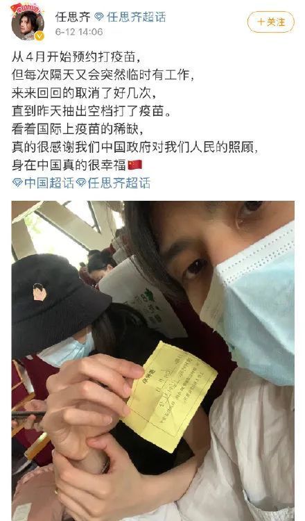 6月12日,任思齐曾发微博称自己打了疫苗,表示“很感谢我们中国政府对我们人民的照顾,身在中国真的很幸福”。