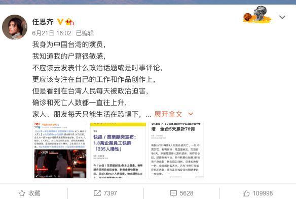 我身为中国台湾的演员,我知道我的户籍很敏感,不应该去发表什么政治话题或是时事评论,更应该专注在自己的工作和作品创作上,但是看到在台湾人民每天被政治迫害,确诊和死亡人数都一直往上升,家人、朋友每天只能生活在恐惧下,我害怕我年纪大的外公、外婆因为疫情而离开,又害怕他们打了有严重副作用的AZ疫苗,而他们90岁的年纪,要回大陆祖国打疫苗或居住也是舟车劳顿,行动不便的他们,甚至要面临被隔离14+7的问题,现在他们也只能待在家里每天看着新闻和害怕。 而台湾省的领导政党和领导人,天天用媒体洗脑台湾民众来抹黑大陆政府,甚至大陆政府免费赠送疫苗也不接受,转过头来污蔑买不到疫苗是因为大陆政府欺压,人民要打疫苗却要人民或私营企业自己来买,这些肮脏手段只为了维持你们的政治权利和钱财。 在大陆有将近8万台胞打了大陆疫苗,并没有任何人因为这疫苗而死亡,我在6月中也才刚在上海接种完,甚至也马上发了微博,所以非常不懂台湾弱智的民进党们要抹黑大陆?你们写的字、说的方言、拜的神明都是来自中国,我在台湾从小到大学的历史也是中国史,你们现在的行为比汉奸更可恶。 我知道是没有名气的小演员,发文没有办法像向左(编者注:佐)或汪小菲那样被关注,甚至没有金钱和物资能帮助现在台湾的家人和朋友。所以我希望更多有影响力的台胞们,不管是台商、企业家、教育家等等…或是艺人、歌手、演员都希望大家站出来,希望大家能帮助台湾渡过疫情,更希望有影响力的你们可以告诉台湾民众,大陆祖国政府并没有迫害你们,真正迫害台湾人民的就是台湾的政客,更期待和平统一台湾那天! 再次希望台湾艺人能站出来为祖国发声