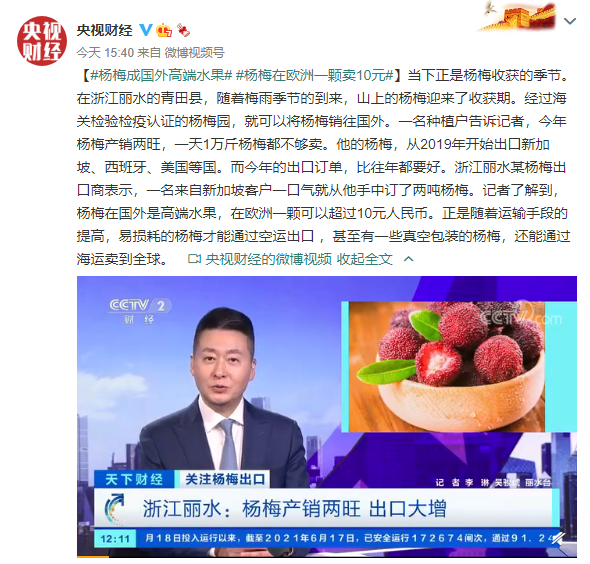 当下正是杨梅收获的季节。在浙江丽水的青田县,随着梅雨季节的到来,山上的杨梅迎来了收获期。经过海关检验检疫认证的杨梅园,就可以将杨梅销往国外。一名种植户告诉记者,今年杨梅产销两旺,一天1万斤杨梅都不够卖。他的杨梅,从2019年开始出口新加坡、西班牙、美国等国。而今年的出口订单,比往年都要好。浙江丽水某杨梅出口商表示,一名来自新加坡客户一口气就从他手中订了两吨杨梅。记者了解到,杨梅在国外是高端水果,在欧洲一颗可以超过10元人民币。正是随着运输手段的提高,易损耗的杨梅才能通过空运出口 ,甚至有一些真空包装的杨梅,还能通过海运卖到全球。