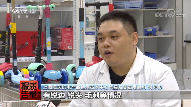 上海海关机电产品检测技术中心玩具及婴童用品科 倪彬彬:玩具滑板车主要存在的问题就是在一个机械物理性能方面有问题,比如说它的钢性材料上的圆孔的直径不符合标准要求,或者在生产过程中有锐边、锐尖、毛刺等情况,或者是在车轮和车体之间的间隙存在夹手指的一个风险。