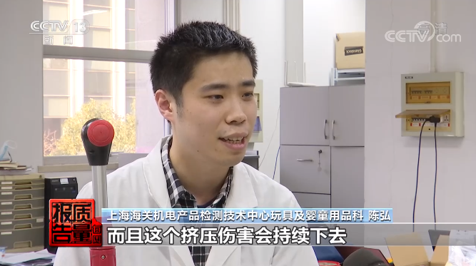 上海海关机电产品检测技术中心玩具及婴童用品科 陈弘:活动部件间隙,它这个部分,车轮是在不断的滚动当中的,小孩子的手指一旦陷入其中将无法拔出来,从而造成相对的挤压的伤害。而且这个挤压伤害会持续下去,因为轮子活动部件是一直在滚动。
