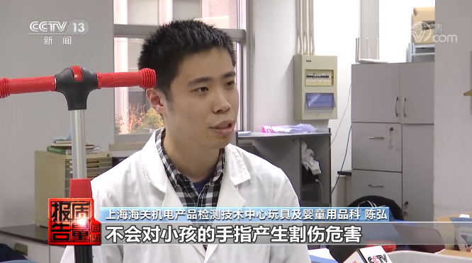 上海海关机电产品检测技术中心玩具及婴童用品科 陈弘:儿童在使用的过程中,有可能把身体压在把手上,导致把手往下压,如果它没锁住的话,整体前方部位会往下掉,儿童整体有可能会造成倾倒,而造成损伤。
