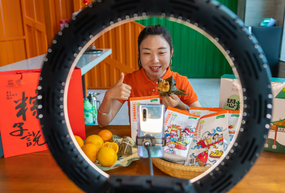 “618”期间,湖北秭归一家农业集团员工在直播销售端午粽。(新华社发)