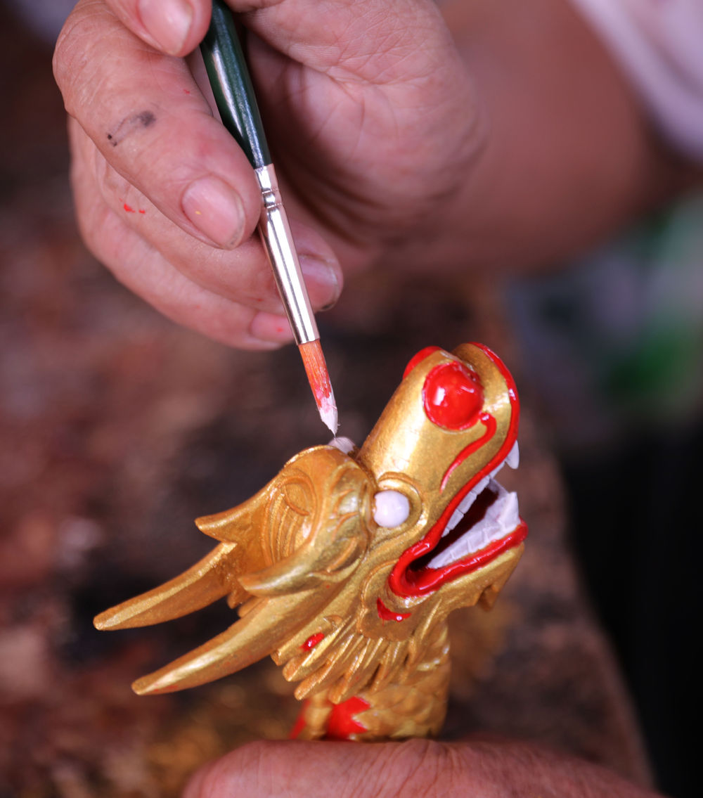 在湖南省永州市道县上关街道水南社区,周承云在作坊里给小龙头上漆(5月16日摄)。