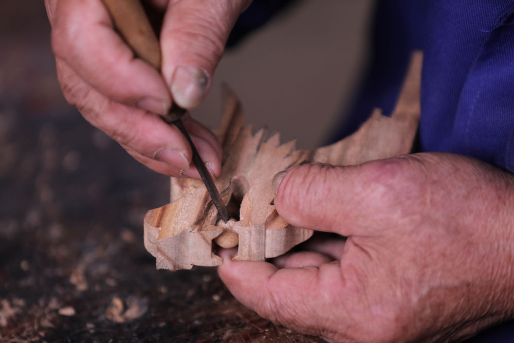在湖南省永州市道县上关街道水南社区,周承云在作坊里雕琢小龙头(5月9日摄)。