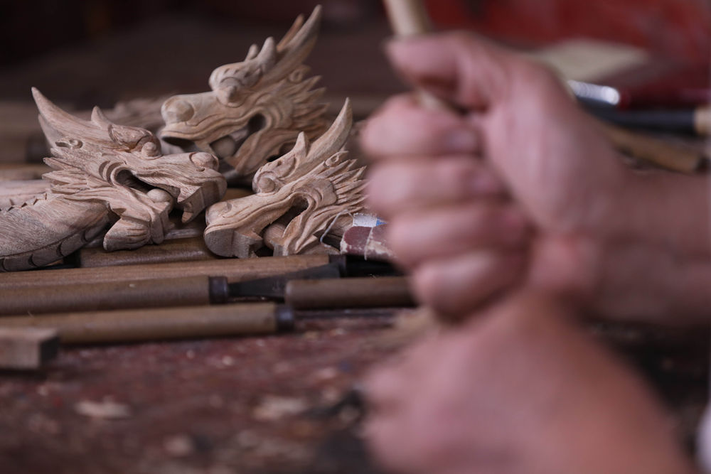 6月13日,在湖南省永州市道县上关街道水南社区,周承云在作坊里雕刻小龙船头。
