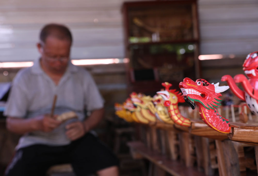 6月13日,在湖南省永州市道县上关街道水南社区,周承云在作坊里给小龙船安装龙头。