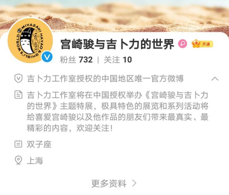 中国证券报记者进一步发现,在微博平台上其实早已就有了这个账号,且相关介绍更为详细,首先这的确是吉卜力工作室授权的中国地区唯一官方微博,同时授权在中国举办《宫崎骏与吉卜力的世界》主题特展。