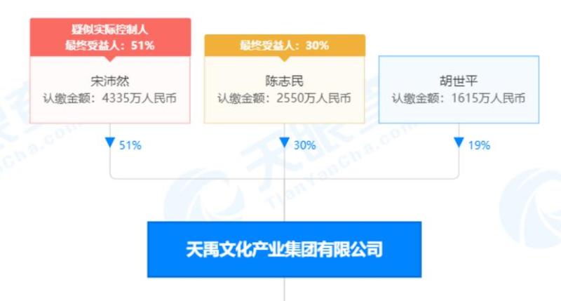 天眼查显示,天禹文化产业集团登记在北京,经营范围包括组织文化艺术交流活动、承办展览展示活动等等,其大股东为宋沛然,持股51%。