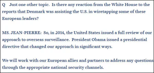 被监听的德国社会民主党前领袖施泰因布吕克说:“盟国的情报机构拦截和监听其他国家政要,这很荒唐,是一桩丑闻”;法国欧洲事务部长克莱芒·博纳:“我们必须看看丹麦人作为我们的欧盟伙伴,是否在与美国的合作中犯下错误”;瑞典国防大臣胡尔特奎斯特说:“窃听盟友是不可接受的,已要求丹麦国防部提供完整报告。”