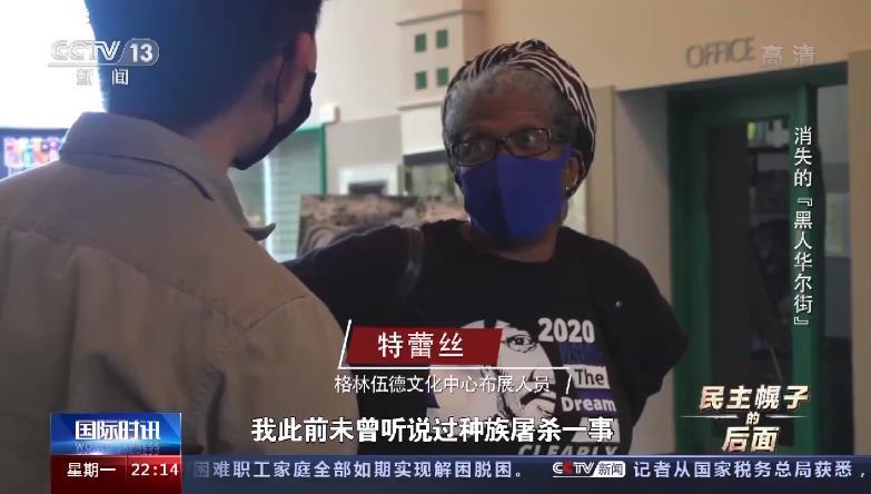 塔尔萨种族屠杀幸存者后代、塔尔萨市议员 凡妮莎·霍尔-哈珀:有人提及塔尔萨“黑人华尔街”发生过种族暴乱,我完全不知道他们在说什么,什么种族暴乱,我就住在离事发地“黑人华尔街”以北7个街区的地方,这是一个秘密,这是禁忌,有人刻意为之让屠杀历史成为一个秘密。