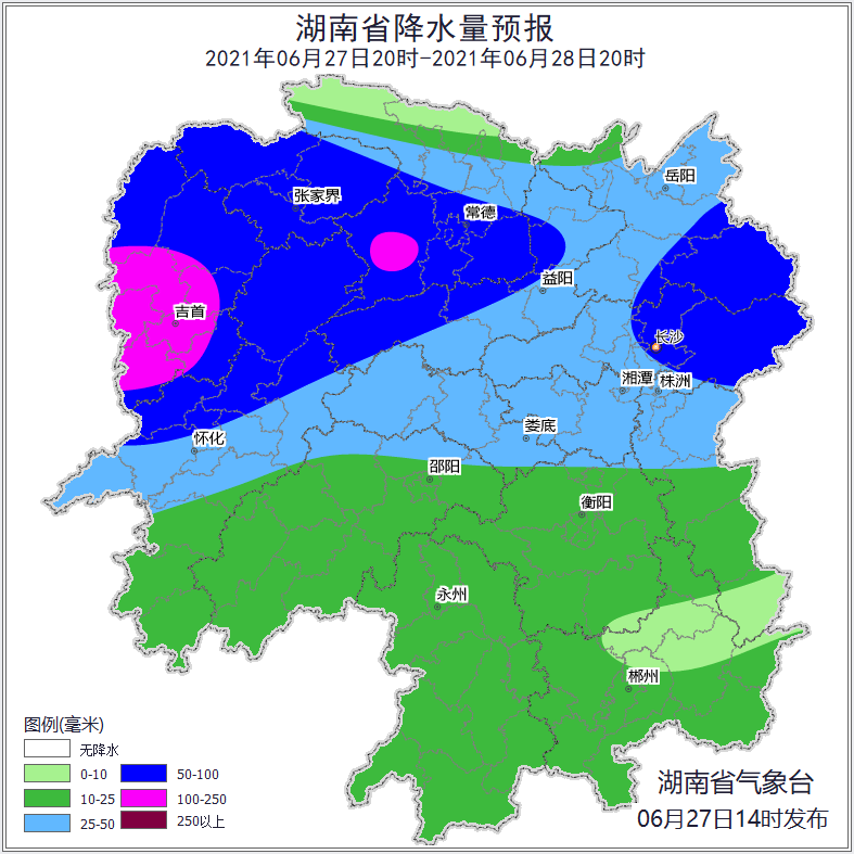 6月27日,湖南省水利厅与省气象局联合发布【湖南省山洪灾害气象风险预警】:自6月27日20:00至28日20:00,受降雨影响,岳阳市、湘西自治州、张家界市、常德市、怀化市等局地可能发生山洪灾害(蓝色预警),岳阳市、长沙市、湘西自治州、张家界市、常德市、怀化市等局地发生山洪灾害的可能性较大(黄色预警),其中,张家界市、常德市等局地发生山洪灾害的可能性大(橙色预警)。