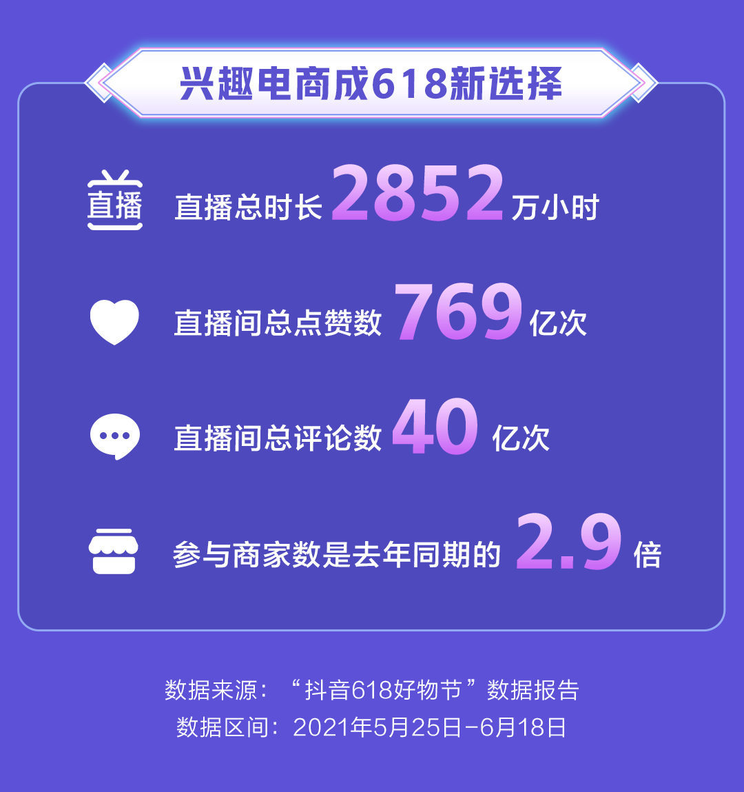 新湖南客户端6月21日讯 6月19日,“抖音618好物节”数据报告发布。报告显示,自5月25日至6月18日,抖音电商直播间时长累计达2852万小时,用户互动活跃,直播间共点赞769亿次,兴趣电商成为广大消费者购物新选择。