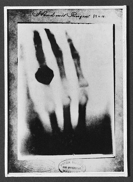 实验室是完全遮光的暗室。在接上高压电源进行实验中,伦琴意外地发现,一米以外的一个荧光屏发出微弱的闪光。一旦切断电源,荧光就立即消失。他选择了许多材料来作为障碍物,包括自己的手指。伦琴用食指和拇指捏着一片铅板,放到了射线经过的位置,他惊奇地在铅板上看到了自己手指的图像,手指的骨头产生了比周围的软组织更深的阴影。