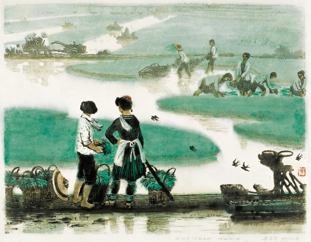 △吴家华,《侗乡三月》,水印套色,44cm×59cm,1976