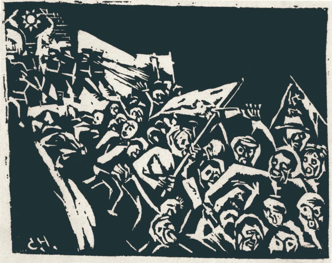 △江丰,《抗战者》,14cm×17.7cm,黑白木刻,1931