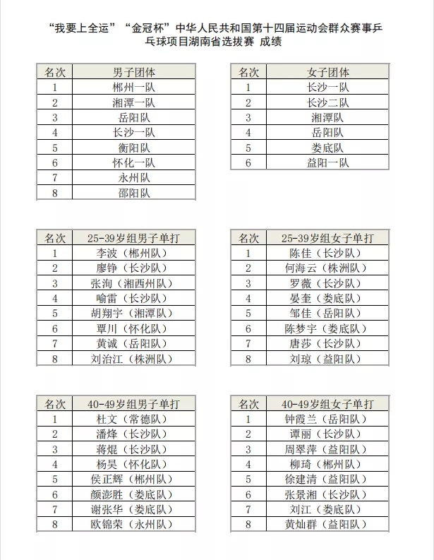 根据第十四届全运会群众比赛乒乓球项目竞赛规程,本次选拔赛各年龄段冠军选手将组成湖南男、女子团体出战全运会预赛,同时获得单打资格。