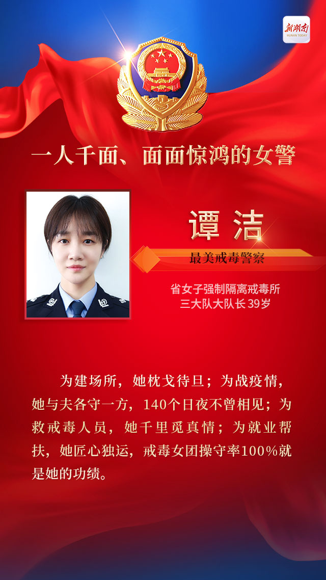 16年来,谭洁获得 “全国统一戒毒模式先进个人” “省司法厅岗位练兵先进个人”“湖南司法行政系统先进个人”“全省司法行政戒毒系统疫情防控先进个人”等多项荣誉称号,荣记个人三等功两次。而让她最有成就感和获得感的,是所里“戒毒女团”22名成员100%的操守率,是每一位戒毒学员回归社会后打来电话发来信息跟她诉说着当下生活的静好。