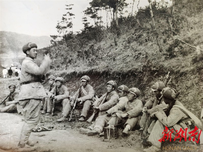 (担任志愿军文化教员的戴笃伯(前排左一)指挥战士唱歌。汉寿县档案馆供图)