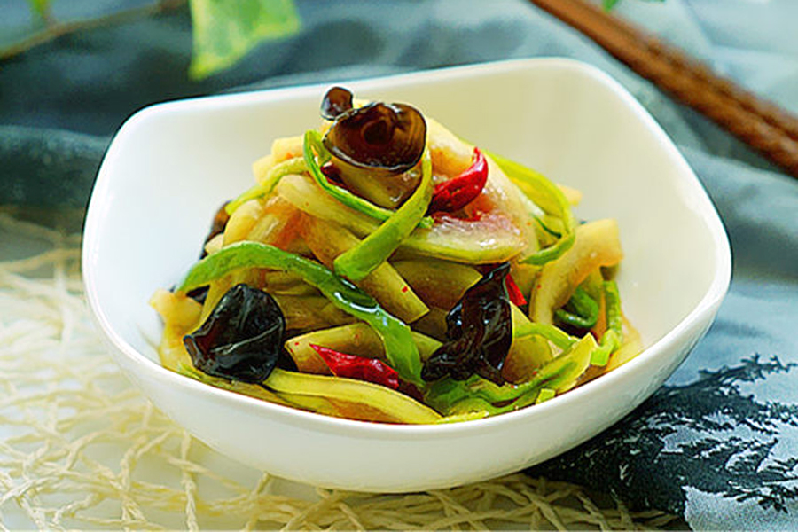 先准备好食材:提前泡发木耳,用勺子挖出瓜瓤,翻面将西瓜皮层硬的青衣削去,再将西瓜皮切成薄片,撒盐腌渍。备好葱姜蒜及青红椒丝,热锅入油烧至6分热爆香,倒入西瓜皮翻炒至断生,放入适量醋汁,继续翻炒半分钟,撒入葱花和黑木耳翻炒半分钟关火起锅装盘。